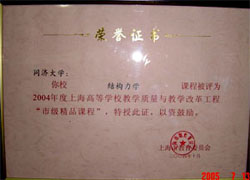 上海市实验教学示范中心, 2006 年 国家级 精品课程, 结构力学, 2005 年 上海市 精品课程, 结构力学 , 2004 年
