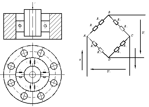 载荷测量是通过负荷传感器来完成的,本实验所用的负荷传感器为应变片式拉、压力传感器,由于这种传感器以电阻应变片为敏感元件,并将被测物理量转换成为电信号,因此便于实现测量数字化和自动化。应变片式拉、压力传感器有圆筒式、轮辐式等类型,本试验机上采用轮辐式传感器。见图1-5所示,应变片通常接成全桥以提高其灵敏度和实现温度补偿。