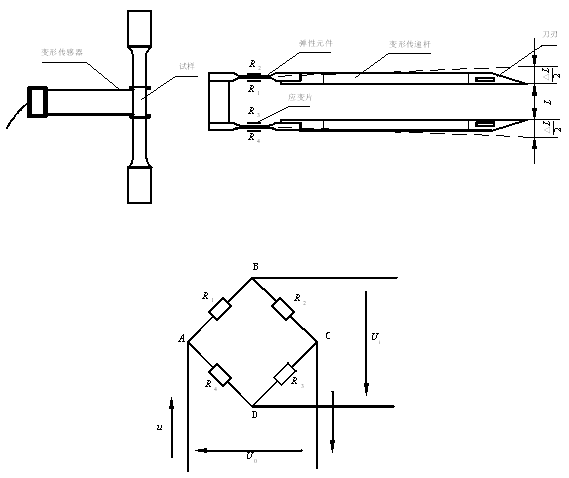 试样的伸长变形量是通过变形传感器来测得的。本实验所用的变形传感器为应变式轴向引伸仪。其外形、结构原理及应变测量桥路分别见图1-6(a)、(b)、(c)所示。引伸仪主要由刚性变形传递杆、弹性元件及贴在其上的应变片和刀刃等部件所组成。
