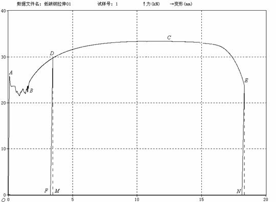 本次实验采用牌号为Q235的碳素结构钢,其含碳量在0.14~0.22%范围内,把试样装在电子万能试验机上进行拉伸实验,拉力由负荷传感器测得,位移由光电编码传感器测得,变形由安装在试样上的电子引伸计测得。由于负荷传感器、位移传感器和电子引伸计都通过数字控制器与计算机相连接,因此,低碳钢拉伸时的力和位移曲线、力和变形的关系曲线都直接反映在了显示器上,并保存于计算机。通过一定的计算软件,对应低碳钢拉伸时的应力-应变的关系曲线也可获得。